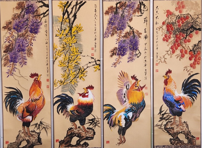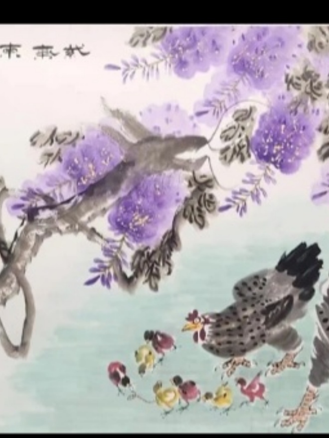 从他的代表作《九峰冠华》中,更能深刻领略其艺术魅力与文化内涵 。这幅作品以雄鸡、紫藤花和石头为主要描绘对象,笔墨技法精湛,色彩运用丰富,构图布局合理 。雄鸡的羽毛通过墨色的浓淡干湿处理,呈现出丰富的层次感和立体感,紫藤花的淡雅与雄鸡的鲜艳形成鲜明对比,突出了画面的主题 。而“九峰”“紫藤花”“石头”等元素又蕴含着深厚的文化寓意,体现了中国传统文化中吉祥、美好、坚韧等价值观 。